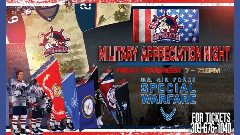 Friday Night at Carver Arena it is Military Appreciation Night with your Peoria Rivermen! Don't miss the camo jerseys' special giveaways from CxT Roasting Company and special ticket discounts for active duty military and veterans! Call 309-676-1040 NOW to get your tickets! ...